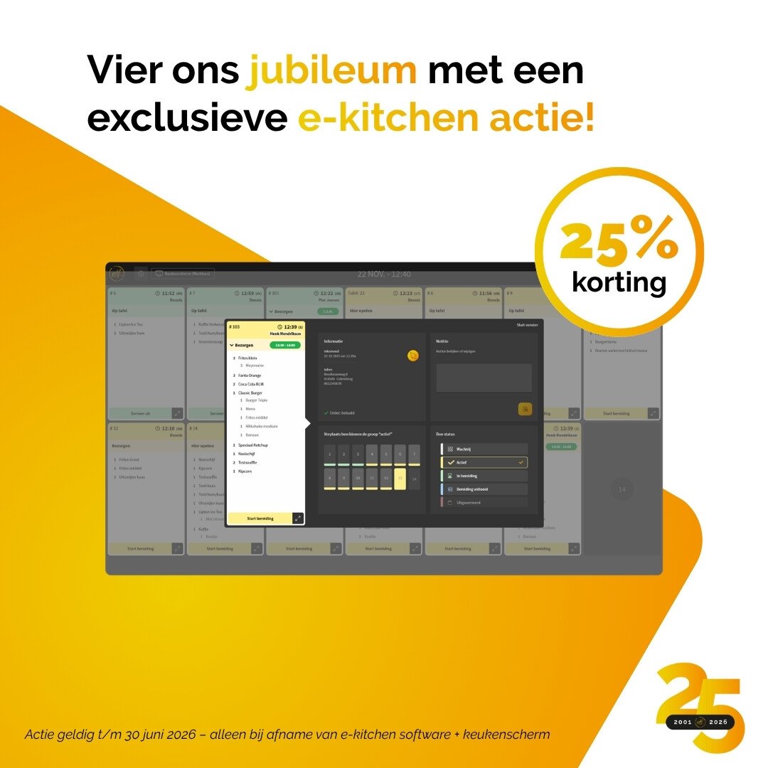 Speciaal voor ons jubileum ontvang je korting op zowel de licentie als eenhet keukenscherm. Deze actie is tijdelijk geldig tot en met 30 juni 2026 en geldt bij afname van zowel de e-kitchen software als een keukenscherm. Wil je zelf ervaren wat e-kitchen voor jouw onderneming kan betekenen? Plan dan direct een demo, we nemen binnen één werkdag contact met je op.